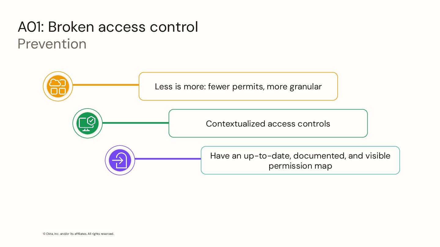 Broken access control Prevention Less is more: fewer permits, more granular Contextualized access controls Have an up-to-date, documented, and visible permission map