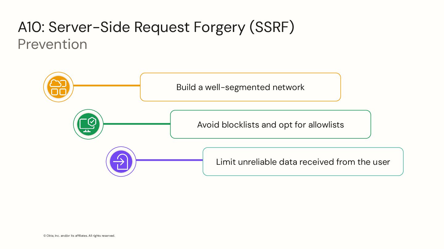 Server-Side Request Forgery (SSRF) Prevention Build a well-segmented network Avoid blocklists and opt for allowlists Limit unreliable data received from the user