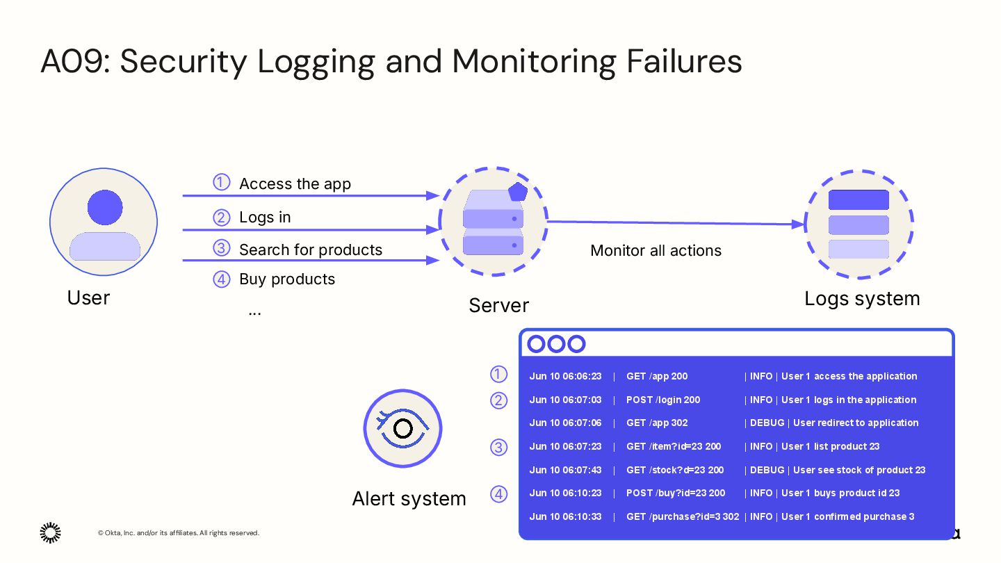 the app Monitor all actions Logs system … 1 User Logs in Search for products Buy products Server Jun 10 06:06:23 | GET /app 200 Jun 10 06:07:03 | POST /login 200 Jun 10 06:07:06 | GET /app 302 Jun 10 06:07:23 | GET /item?id=23 200 Jun 10 06:07:43 | GET /stock?d=23 200 Jun 10 06:10:23 | POST /buy?id=23 200 Jun 10 06:10:33 | GET /purchase?id=3 302 | INFO | User 1 access the application | INFO | User 1 logs in the application | DEBUG | User redirect to application | INFO | User 1 list product 23 | DEBUG | User see stock of product 23 | INFO | User 1 buys product id 23 | INFO | User 1 confirmed purchase 3 2 1 2 3 3 4 4 Alert system A09: Security Logging and Monitoring Failures