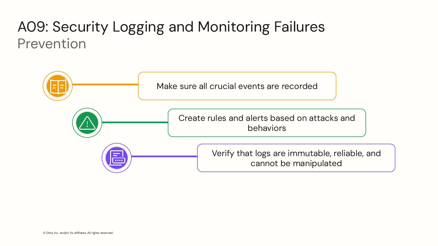 Security Logging and Monitoring Failures Prevention Make sure all crucial events are recorded Create rules and alerts based on attacks and behaviors Verify that logs are immutable, reliable, and cannot be manipulated