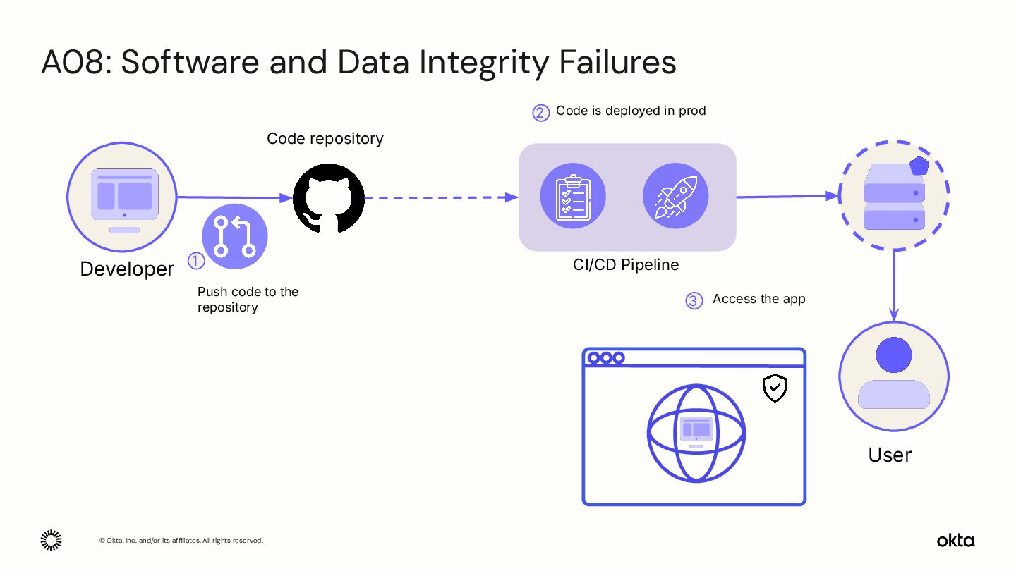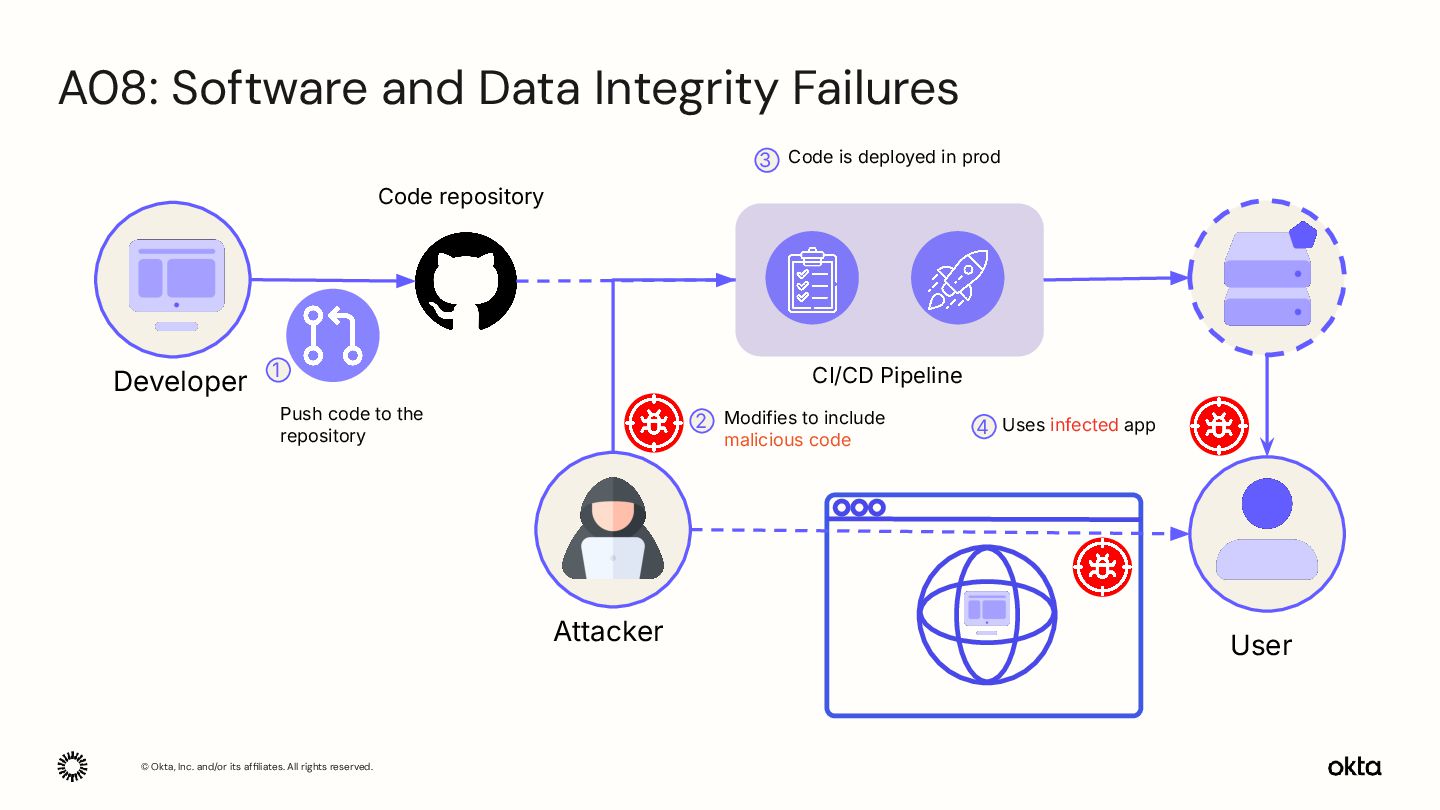 Developer CI/CD Pipeline User Code repository 1 2 3 4 Push code to the repository Modifies to include malicious code Uses infected app Code is deployed in prod A08: Software and Data Integrity Failures