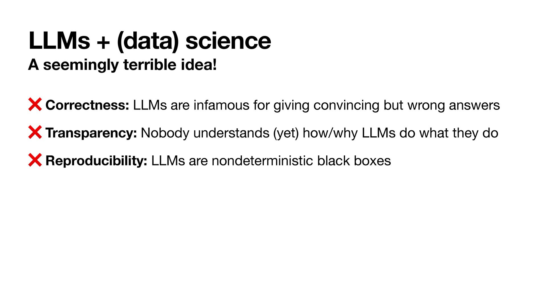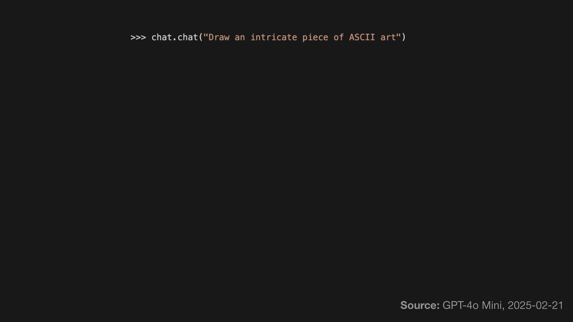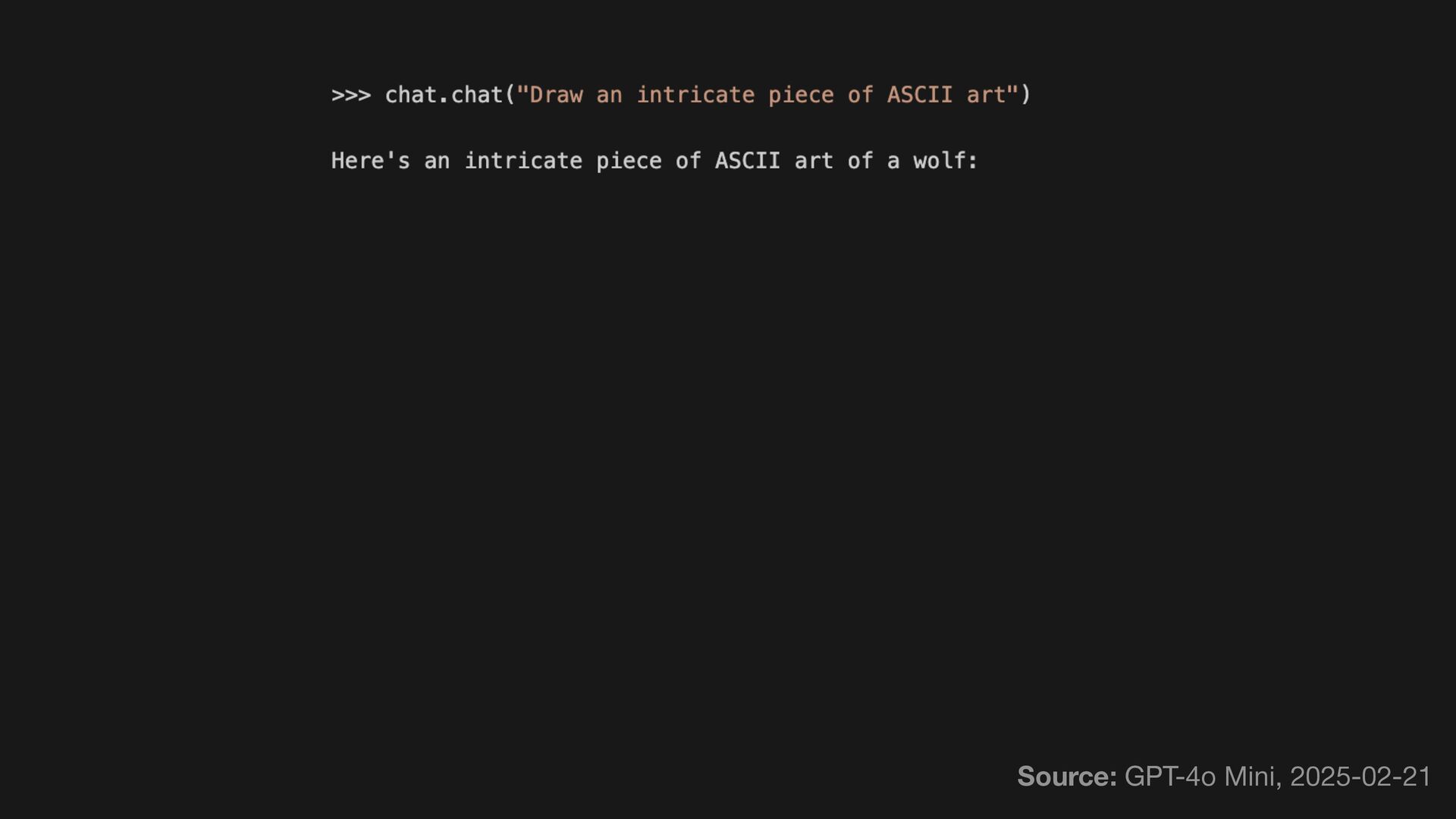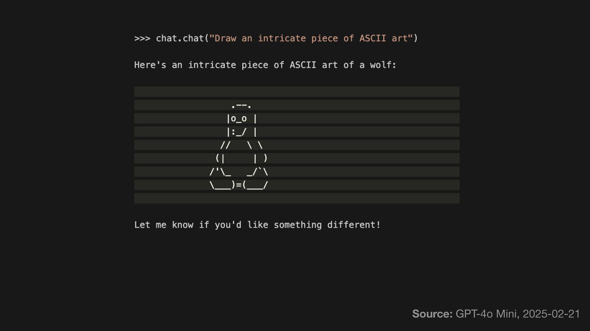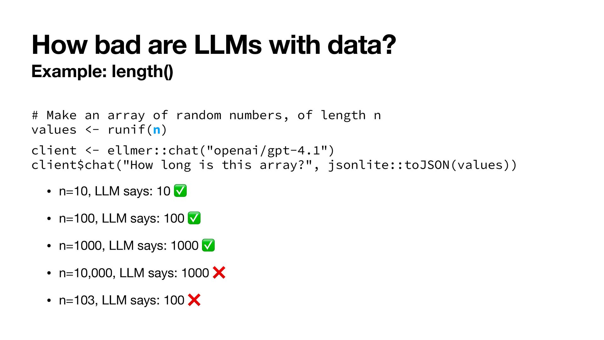 an array of random numbers, of length n values <- runif(n) client <- ellmer::chat("openai/gpt-4.1") client$chat("How long is this array?", jsonlite::toJSON(values)) • n=10, LLM says: 10 ✅ • n=100, LLM says: 100 ✅ • n=1000, LLM says: 1000 ✅ • n=10,000, LLM says: 1000 ❌ • n=103, LLM says: 100 ❌