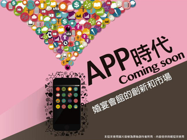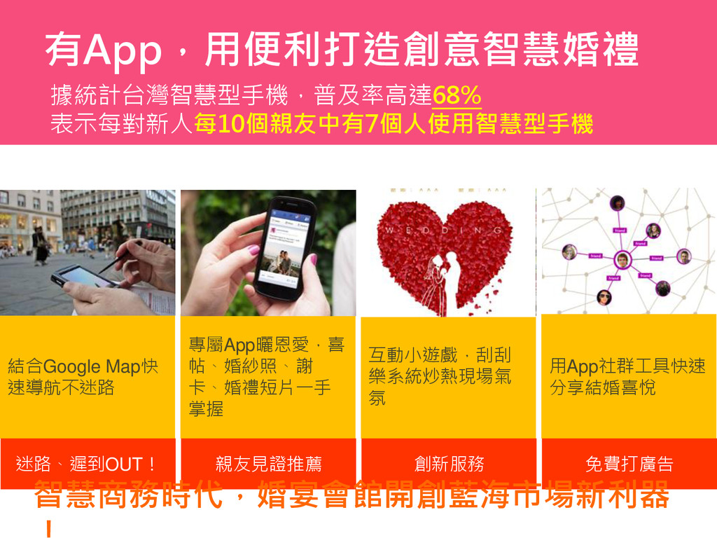 用App社群工具快速 分享結婚喜悅 迷路、遲到OUT! 親友見證推薦 創新服務 免費打廣告 有App,用便利打造創意智慧婚禮 據統計台灣智慧型手機,普及率高達68% 表示每對新人每10個親友中有7個人使用智慧型手機 智慧商務時代,婚宴會館開創藍海市場新利器