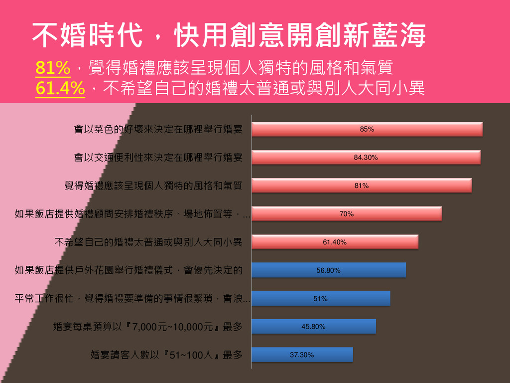 不婚時代,快用創意開創新藍海 81%,覺得婚禮應該呈現個人獨特的風格和氣質 61.4%,不希望自己的婚禮太普通或與別人大同小異 37.30% 45.80% 51% 56.80% 61.40% 70% 81%