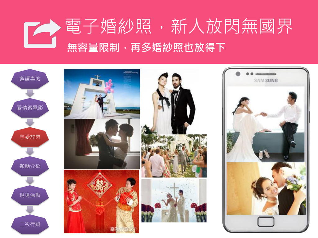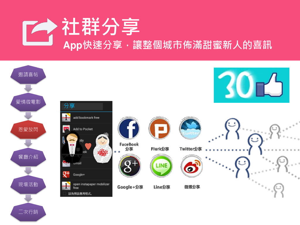 社群分享 App快速分享,讓整個城市佈滿甜蜜新人的喜訊 分享 邀請喜帖 愛情微電影 恩愛放閃 餐廳介紹 現場活動 二次行銷