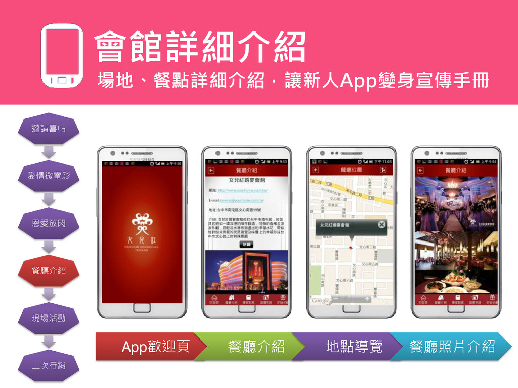 場地、餐點詳細介紹,讓新人App變身宣傳手冊 會館詳細介紹 App歡迎頁 餐廳介紹 地點導覽 餐廳照片介紹 邀請喜帖 愛情微電影 恩愛放閃 餐廳介紹