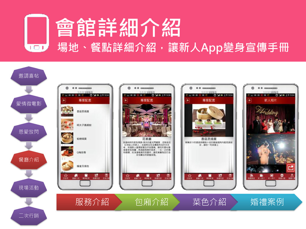 場地、餐點詳細介紹,讓新人App變身宣傳手冊 會館詳細介紹 服務介紹 包廂介紹 菜色介紹 婚禮案例 邀請喜帖 愛情微電影 恩愛放閃 餐廳介紹