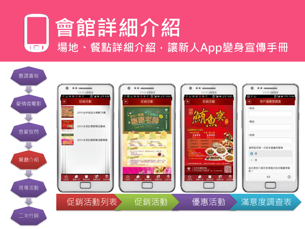 場地、餐點詳細介紹,讓新人App變身宣傳手冊 會館詳細介紹 促銷活動列表 促銷活動 優惠活動 滿意度調查表 邀請喜帖 愛情微電影 恩愛放閃 餐廳介紹
