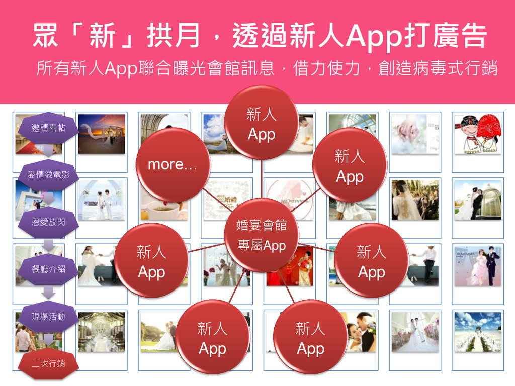 眾「新」拱月,透過新人App打廣告 所有新人App聯合曝光會館訊息,借力使力,創造病毒式行銷 婚宴會館 專屬App 新人 App 新人 App 新人 App