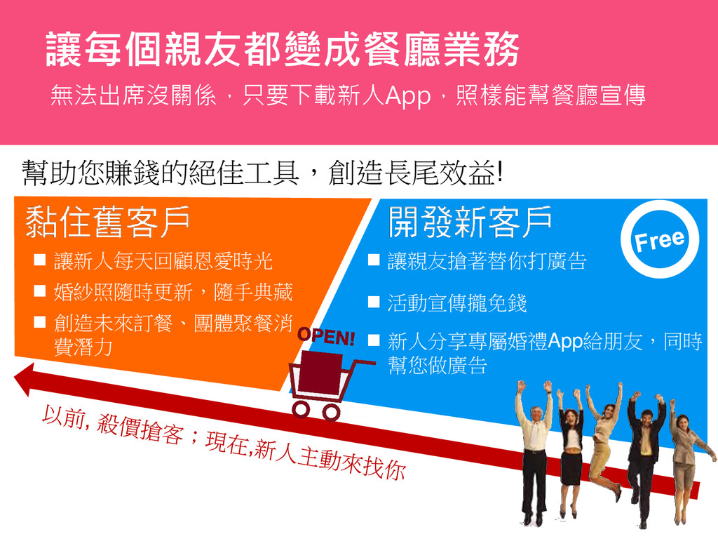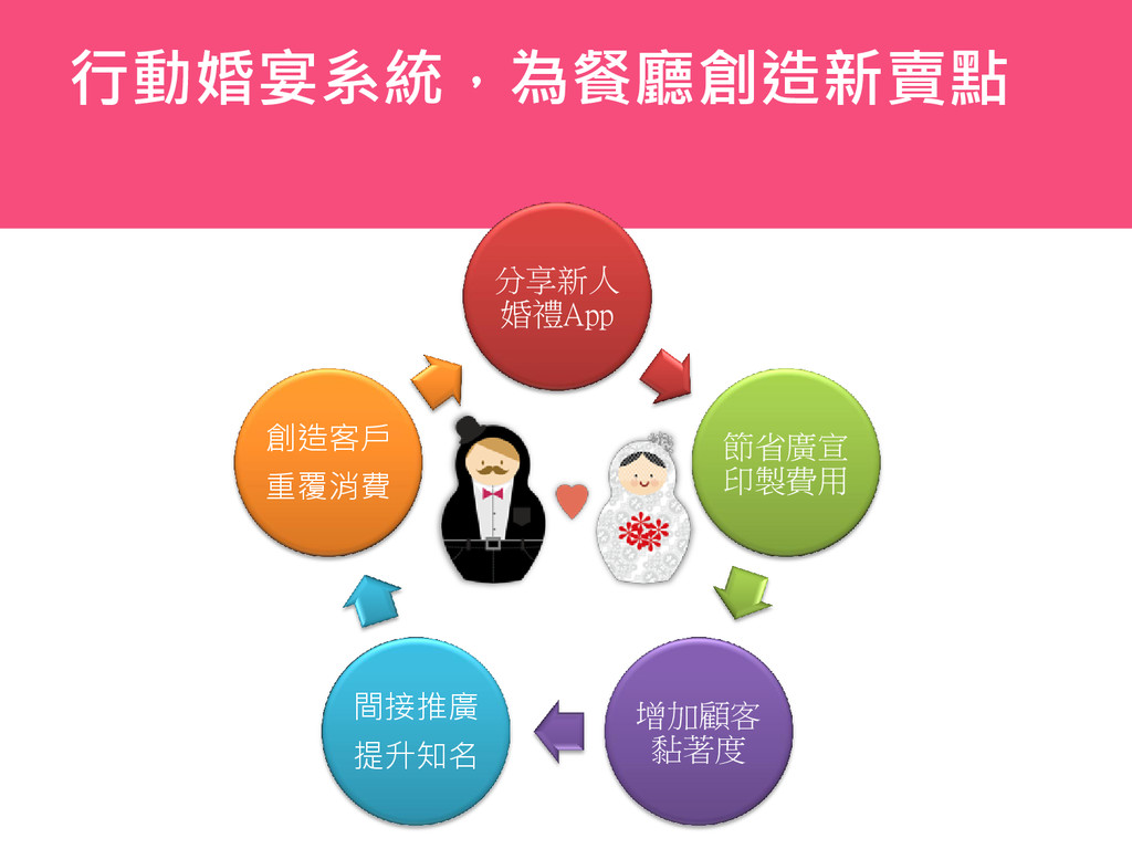 行動婚宴系統,為餐廳創造新賣點 分享新人 婚禮App 節省廣宣 印製費用 增加顧客 黏著度 間接推廣 提升知名 創造客戶