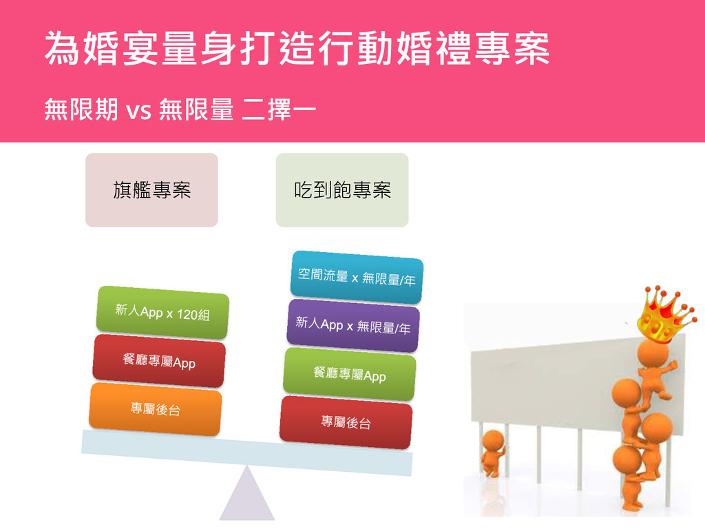 為婚宴量身打造行動婚禮專案 旗艦專案 吃到飽專案 無限期 vs 無限量 二擇一