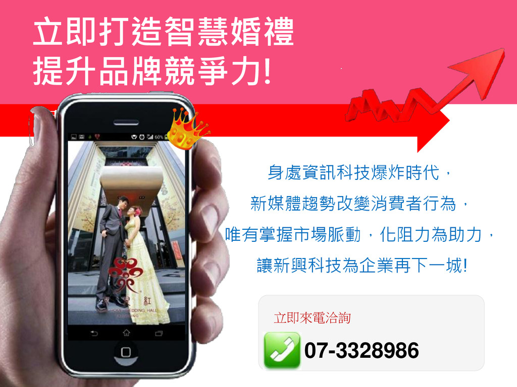 07-3328986 立即打造智慧婚禮 提升品牌競爭力! 身處資訊科技爆炸時代, 新媒體趨勢改變消費者行為, 唯有掌握市場脈動,化阻力為助力, 讓新興科技為企業再下一城! 現在決定未來 立即來電洽詢