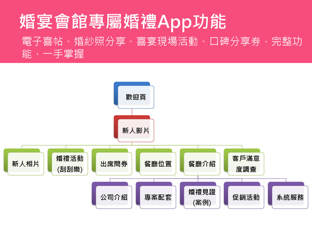 婚禮見證 (案例) 促銷活動 系統服務 客戶滿意 度調查 婚宴會館專屬婚禮App功能 電子喜帖、婚紗照分享、喜宴現場活動、口碑分享券,完整功 能,一手掌握