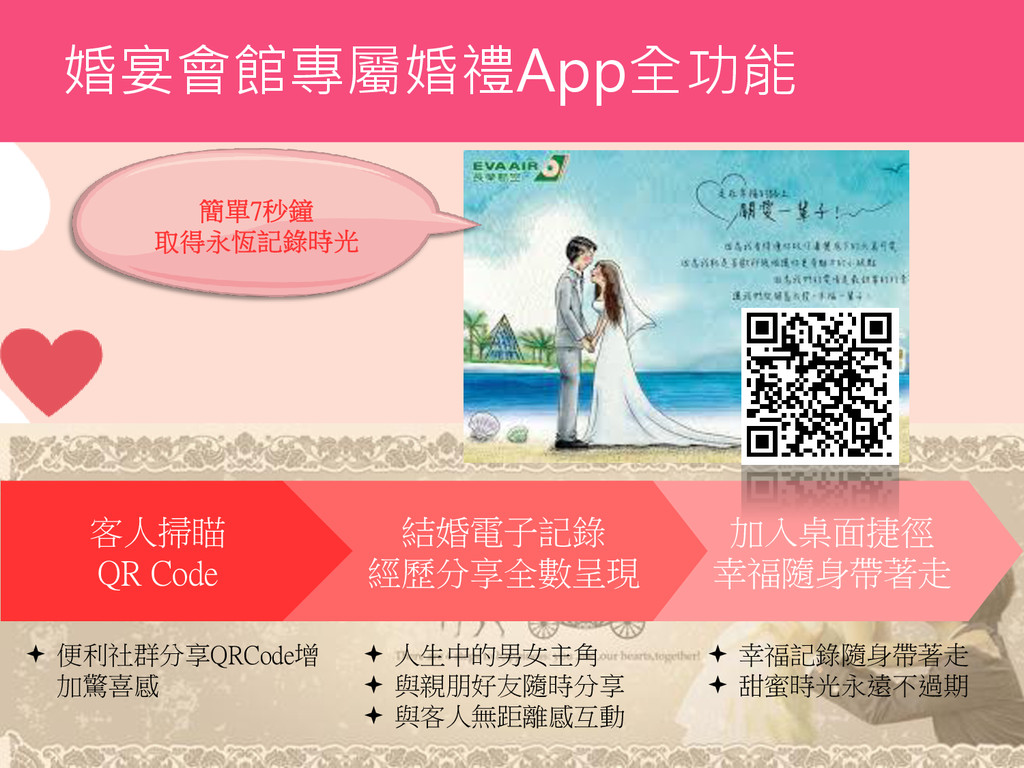 幸福記錄隨身帶著走 甜蜜時光永遠不過期 加入桌面捷徑 幸福隨身帶著走 結婚電子記錄 經歷分享全數呈現 客人掃瞄 QR Code 婚宴會館專屬婚禮App全功能