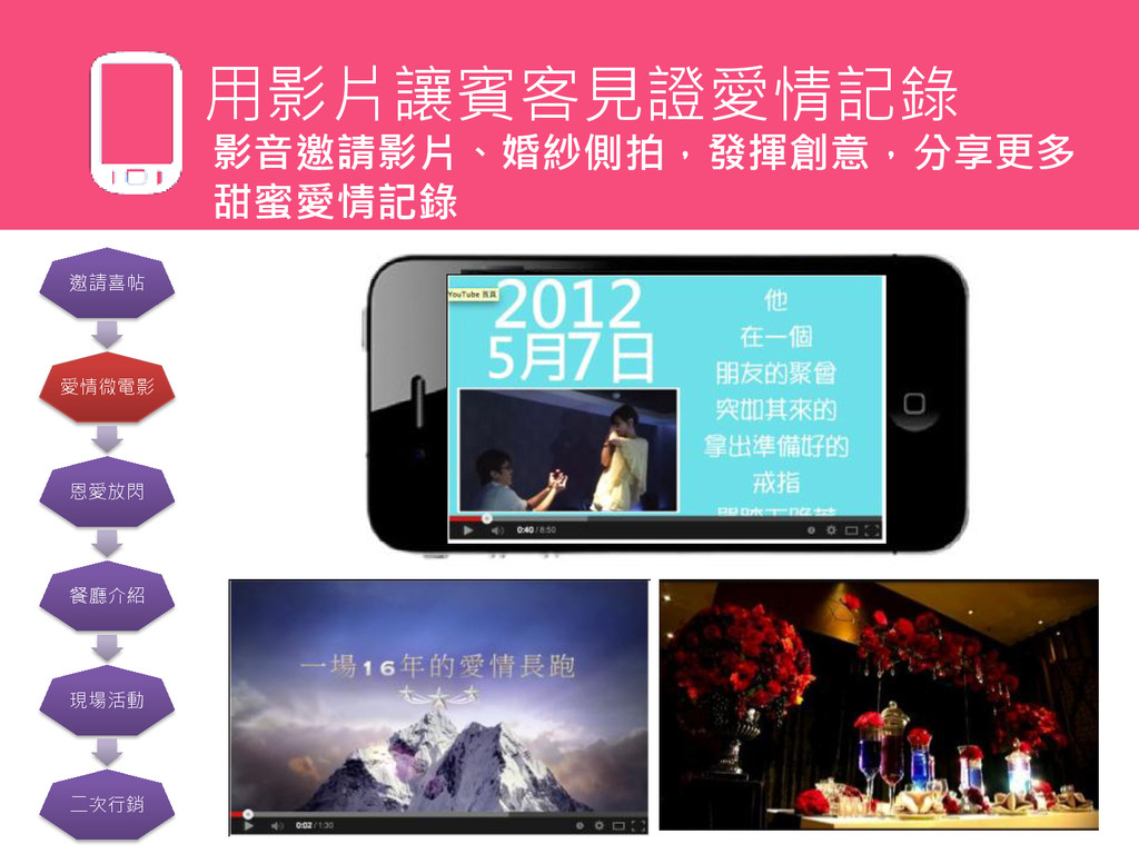 影音邀請影片、婚紗側拍,發揮創意,分享更多 甜蜜愛情記錄 用影片讓賓客見證愛情記錄 邀請喜帖 愛情微電影 恩愛放閃 餐廳介紹 現場活動 二次行銷