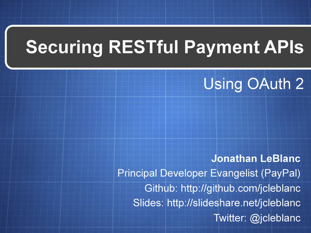 In this talk, we will explore REST and OAuth 2 as standards for building out a secure API infrastructure, exploring many of the architectural decisions that PayPal took in choosing variations in the REST standard and specific implementations of OAuth 2.