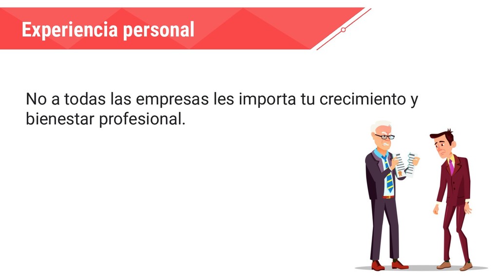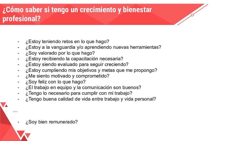 match con lo que estás buscando - Pregunta por el plan de crecimiento profesional - Qué plan de formación o capacitación te ofrecen, como libros, cursos online, etc. (pluralsight, udemy) - Asegúrate de tener un mentor - Pregunta por las herramientas o lenguajes a utilizar y que sean lo que te gustaría utilizar día con día o que realmente te gustaría aprender - ¿Ofrecen clases de inglés o algún tipo de capacitación? - ¿Participan o apoyan a comunidades? - Te ofrecen algún plan de salud (mindfulness, clases de yoga, deportes, descuentos en el gym, etc.) - Tienen opción a trabajar de forma remota - Perks / Beneficios (Desayunos, snacks, días libres, vacaciones, fondo de ahorro, entre otros) … - Pagos competitivos Puntos a tener en cuenta para aceptar un empleo