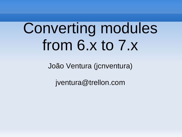 I will summarize the major changes in the API, and where to get further information. I will also present the coder upgrade module which eases this process. Finally I will present a brief example of how to apply this process in an existing module.