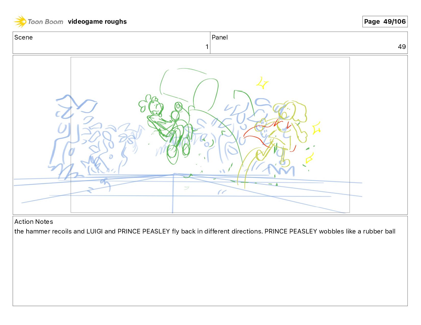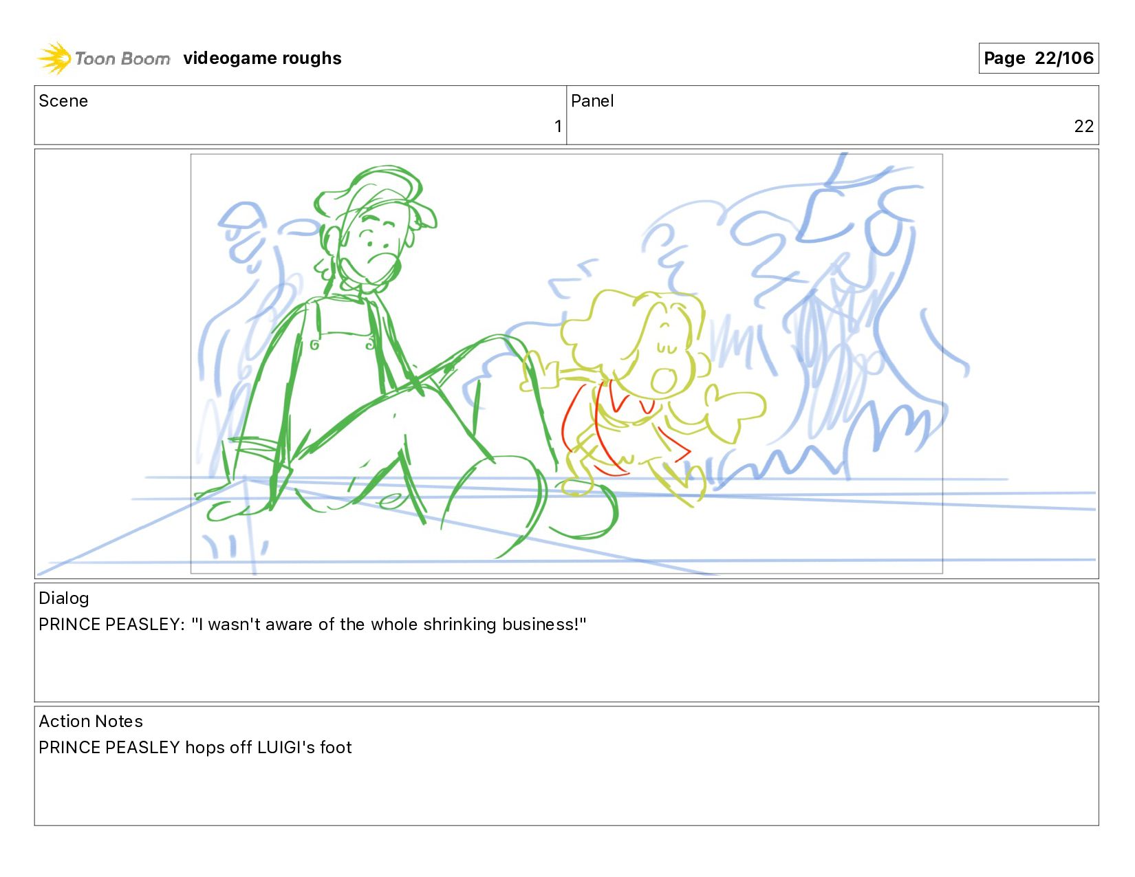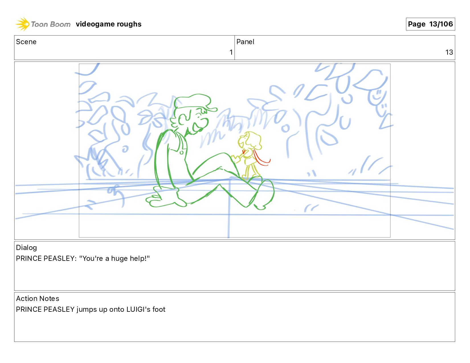 help!" Action Notes PRINCE PEASLEY jumps up onto LUIGI's foot videogame roughs Page 13/106