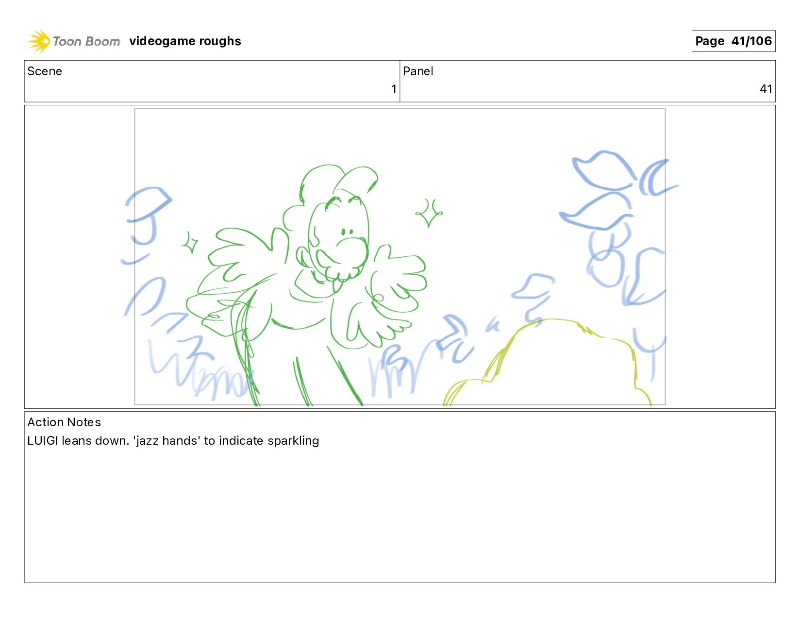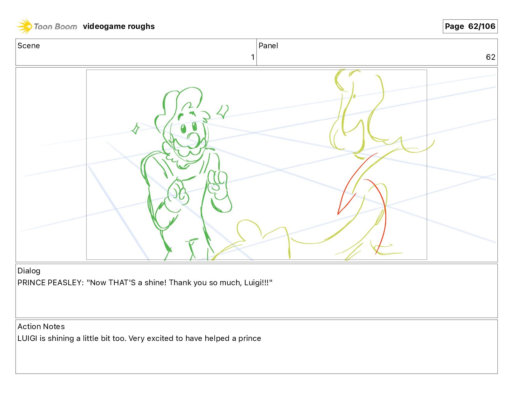 shine! Thank you so much, Luigi!!!" Action Notes LUIGI is shining a little bit too. Very excited to have helped a prince videogame roughs Page 62/106