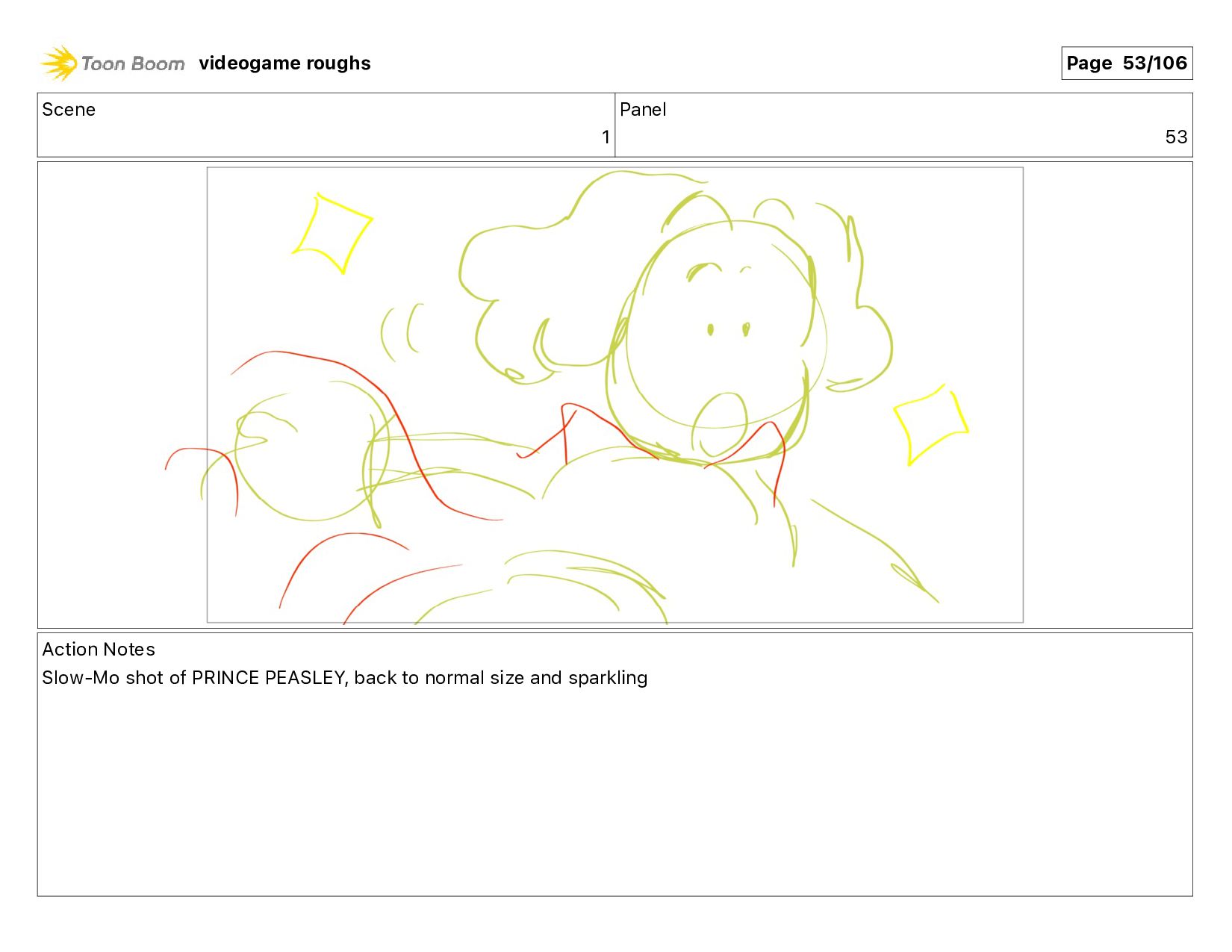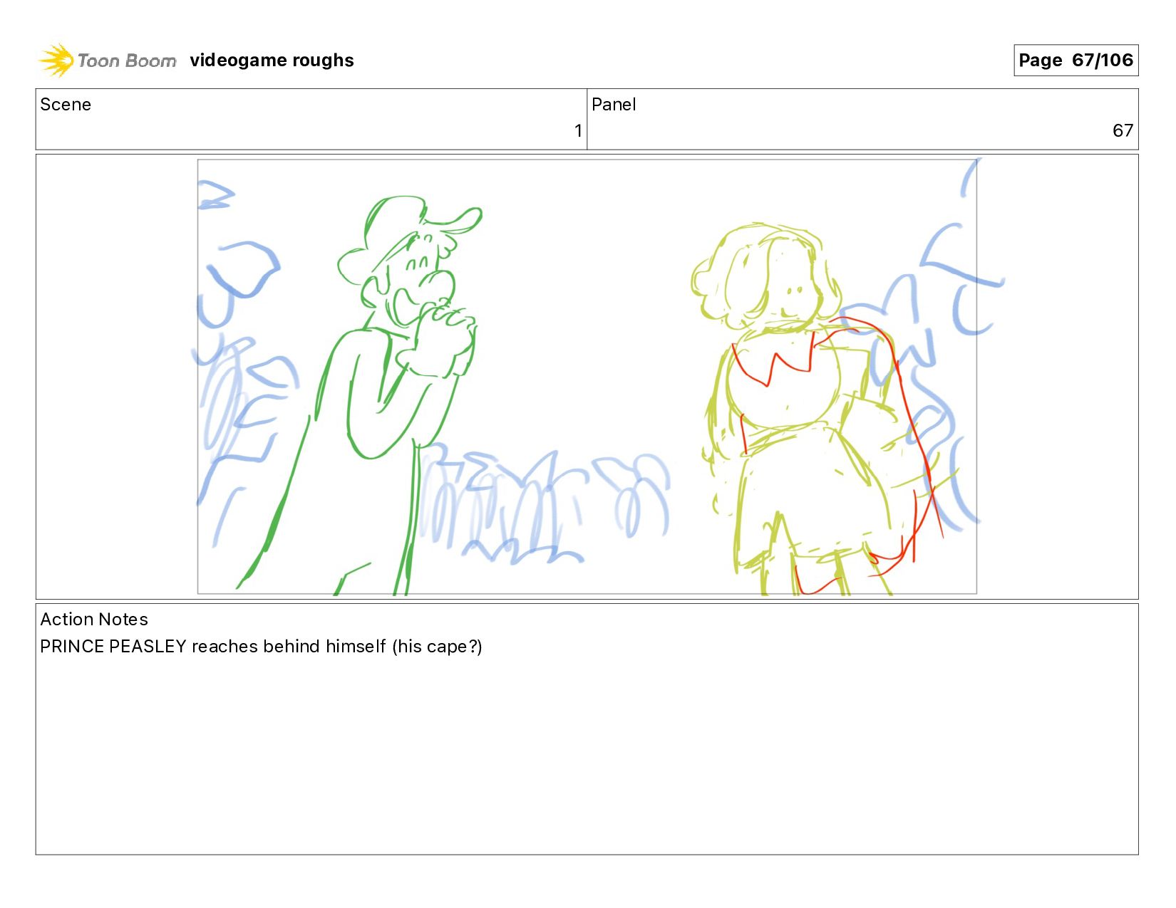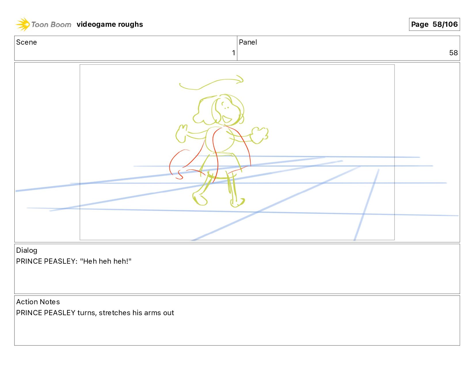Action Notes PRINCE PEASLEY turns, stretches his arms out videogame roughs Page 58/106