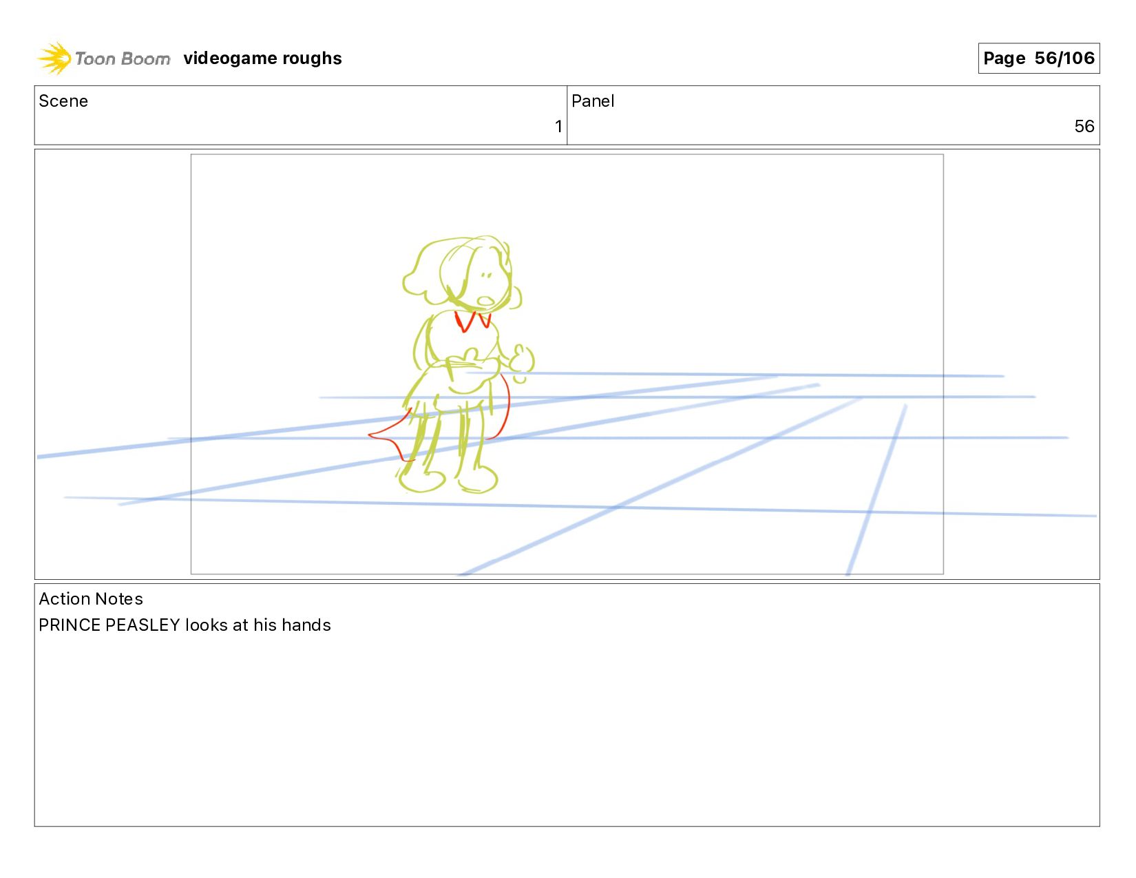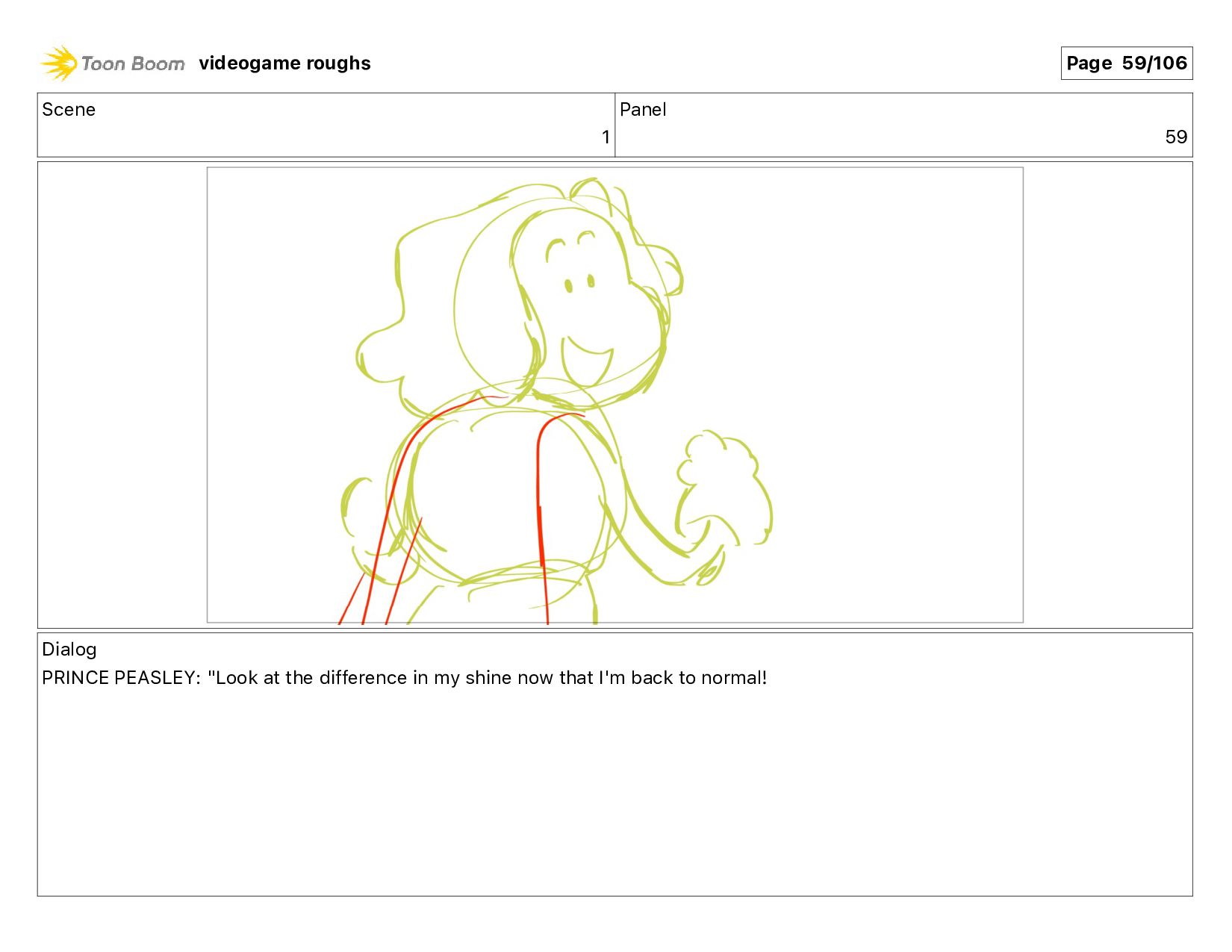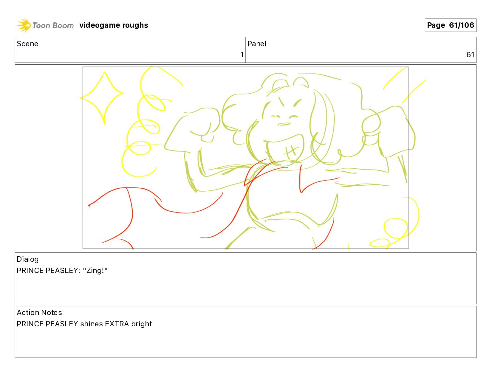 Action Notes PRINCE PEASLEY turns, stretches his arms out videogame roughs Page 58/106
