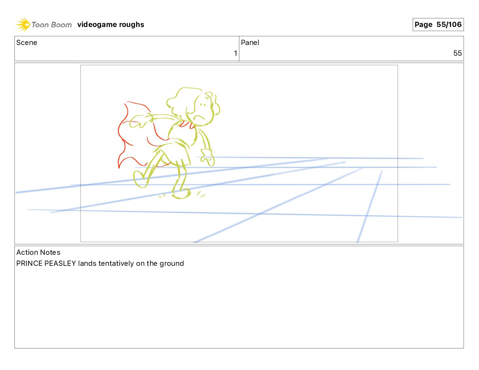 Scene 1 Panel 55 Action Notes PRINCE PEASLEY lands tentatively