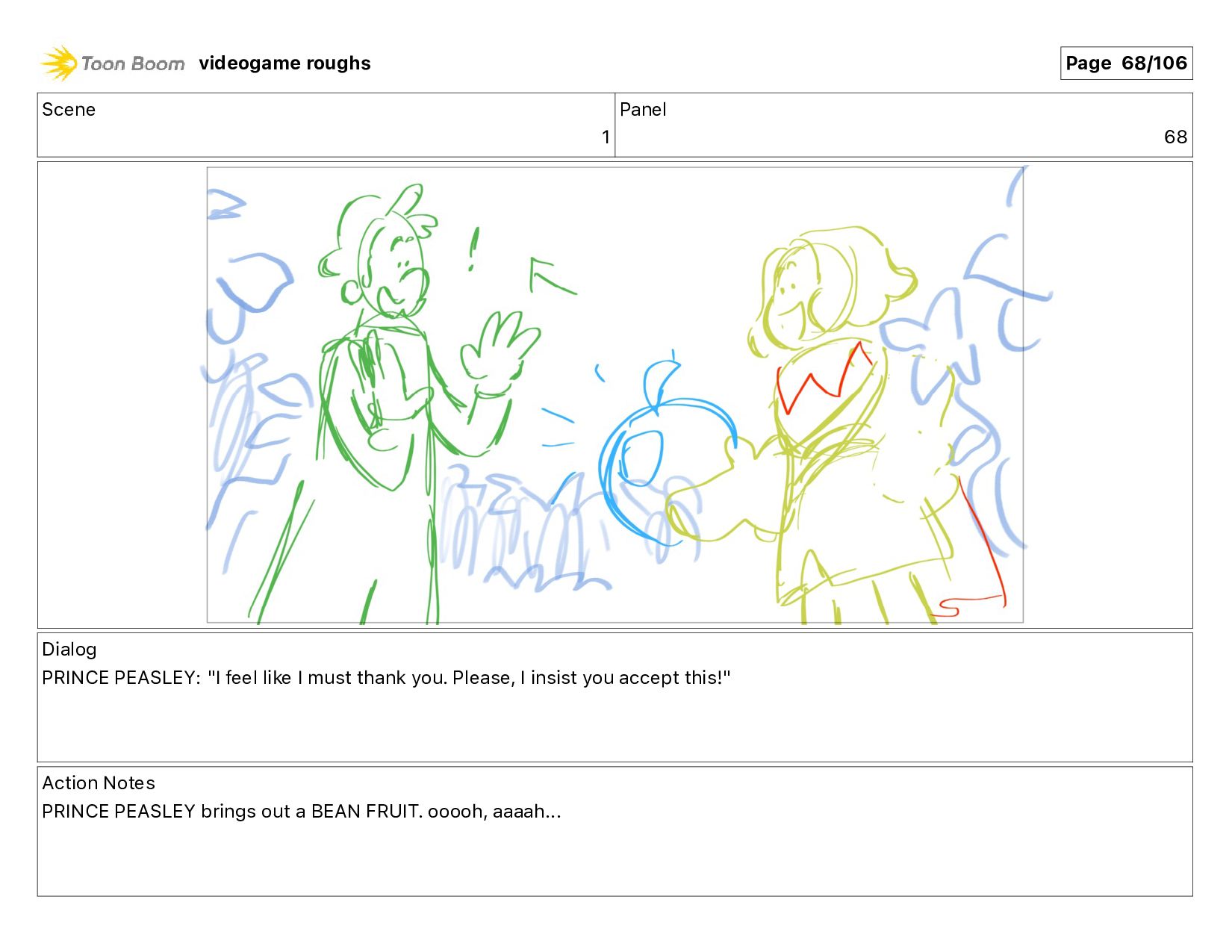 I must thank you. Please, I insist you accept this!" Action Notes PRINCE PEASLEY brings out a BEAN FRUIT. ooooh, aaaah... videogame roughs Page 68/106