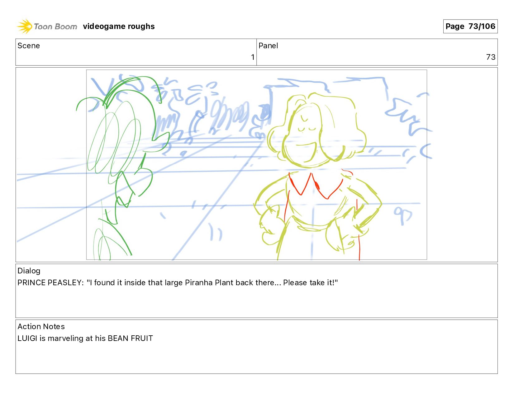 inside that large Piranha Plant back there... Please take it!" Action Notes LUIGI is marveling at his BEAN FRUIT videogame roughs Page 73/106
