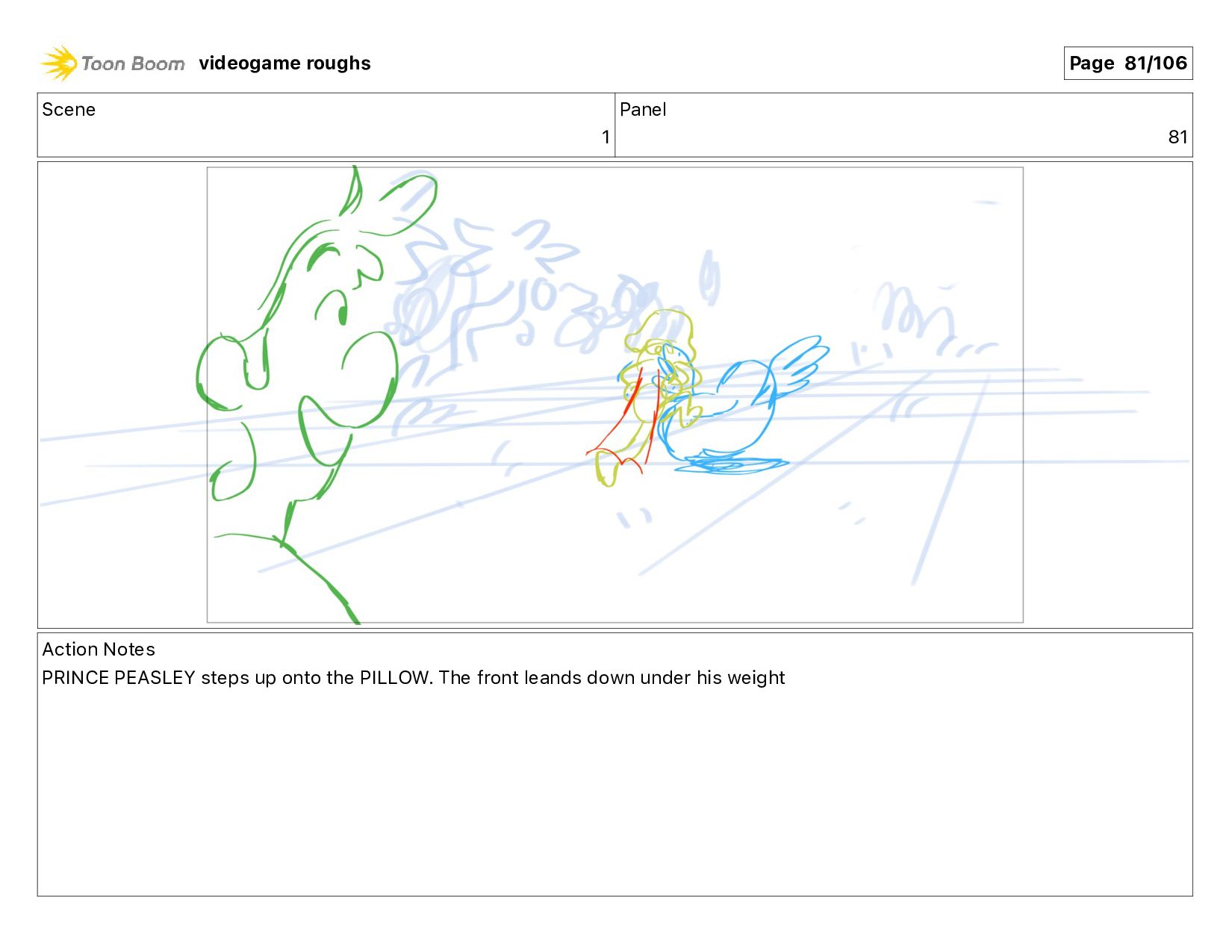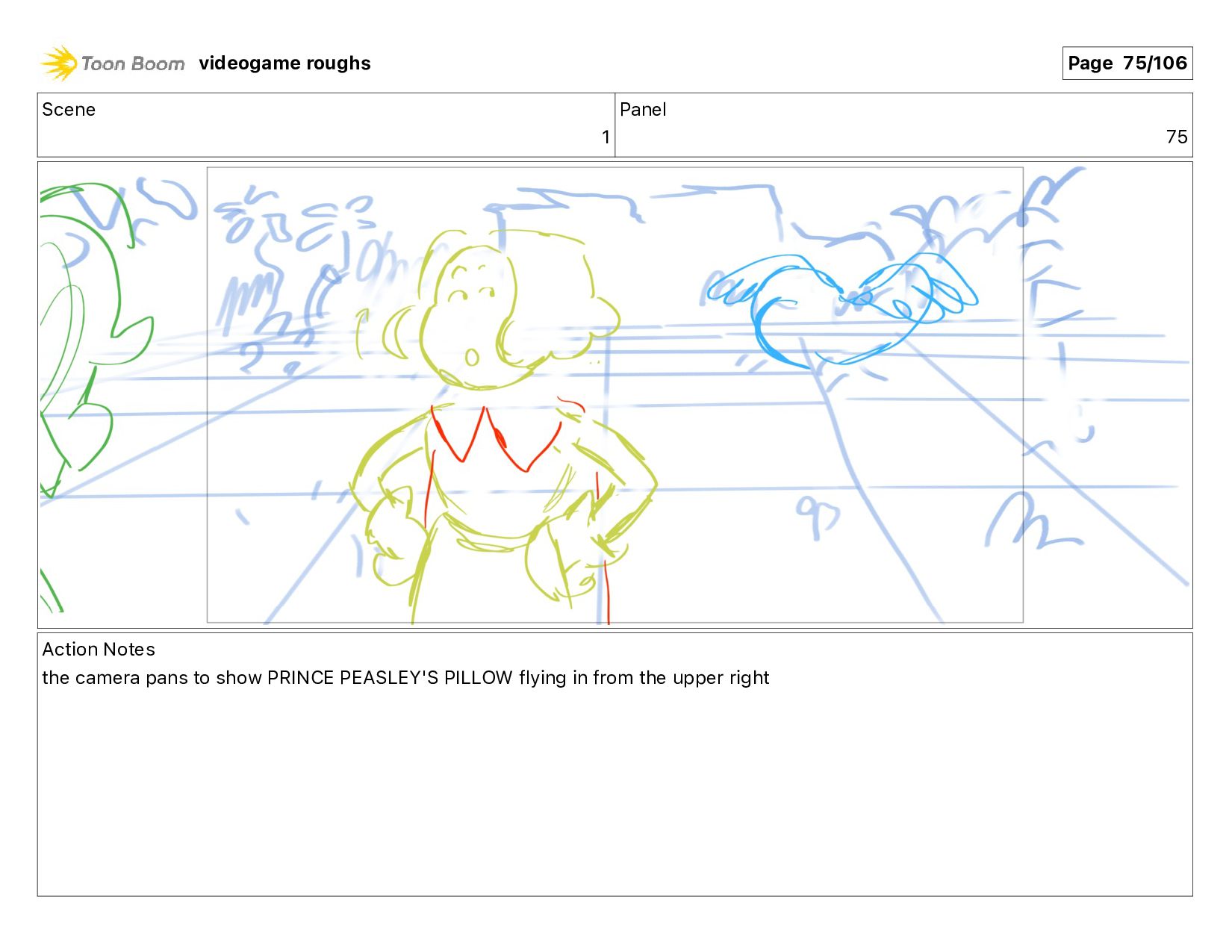 show PRINCE PEASLEY'S PILLOW flying in from the upper right videogame roughs Page 75/106