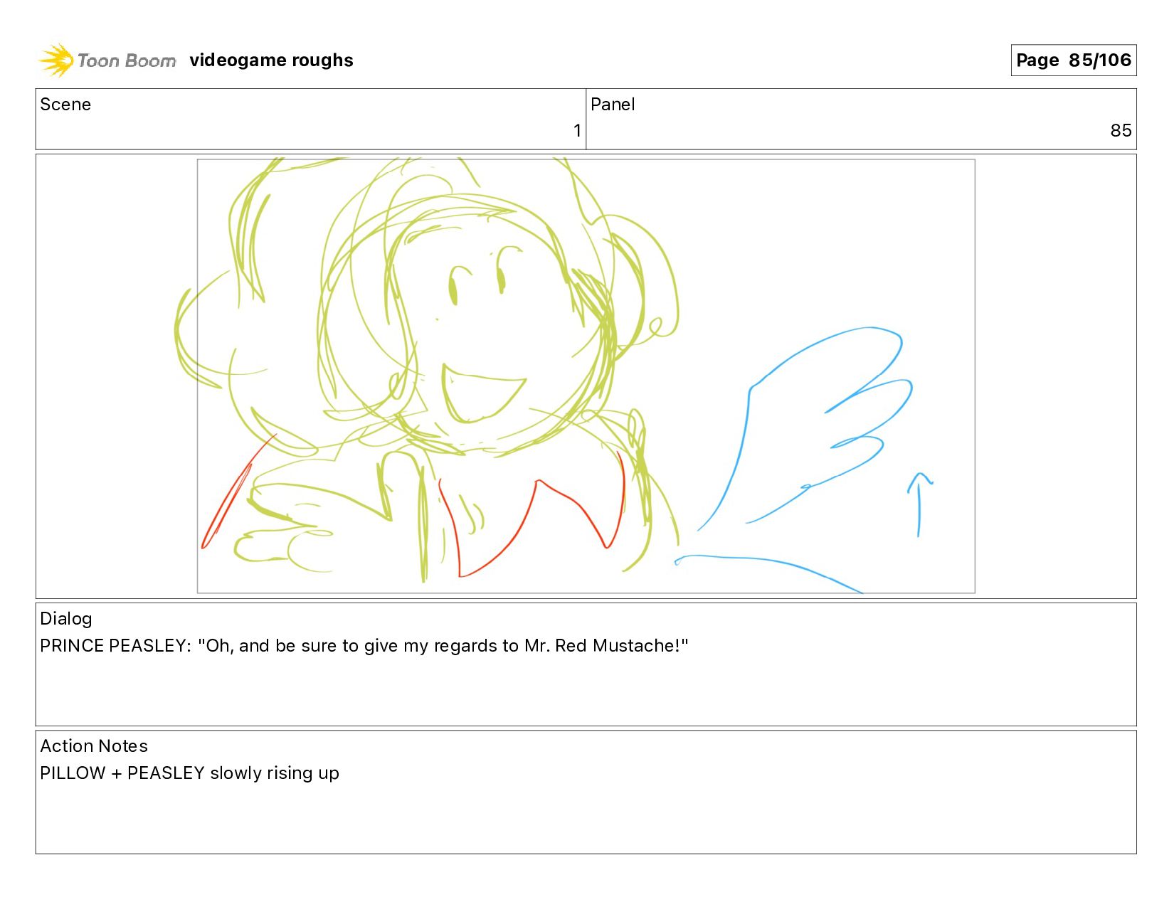 sure to give my regards to Mr. Red Mustache!" Action Notes PILLOW + PEASLEY slowly rising up videogame roughs Page 85/106