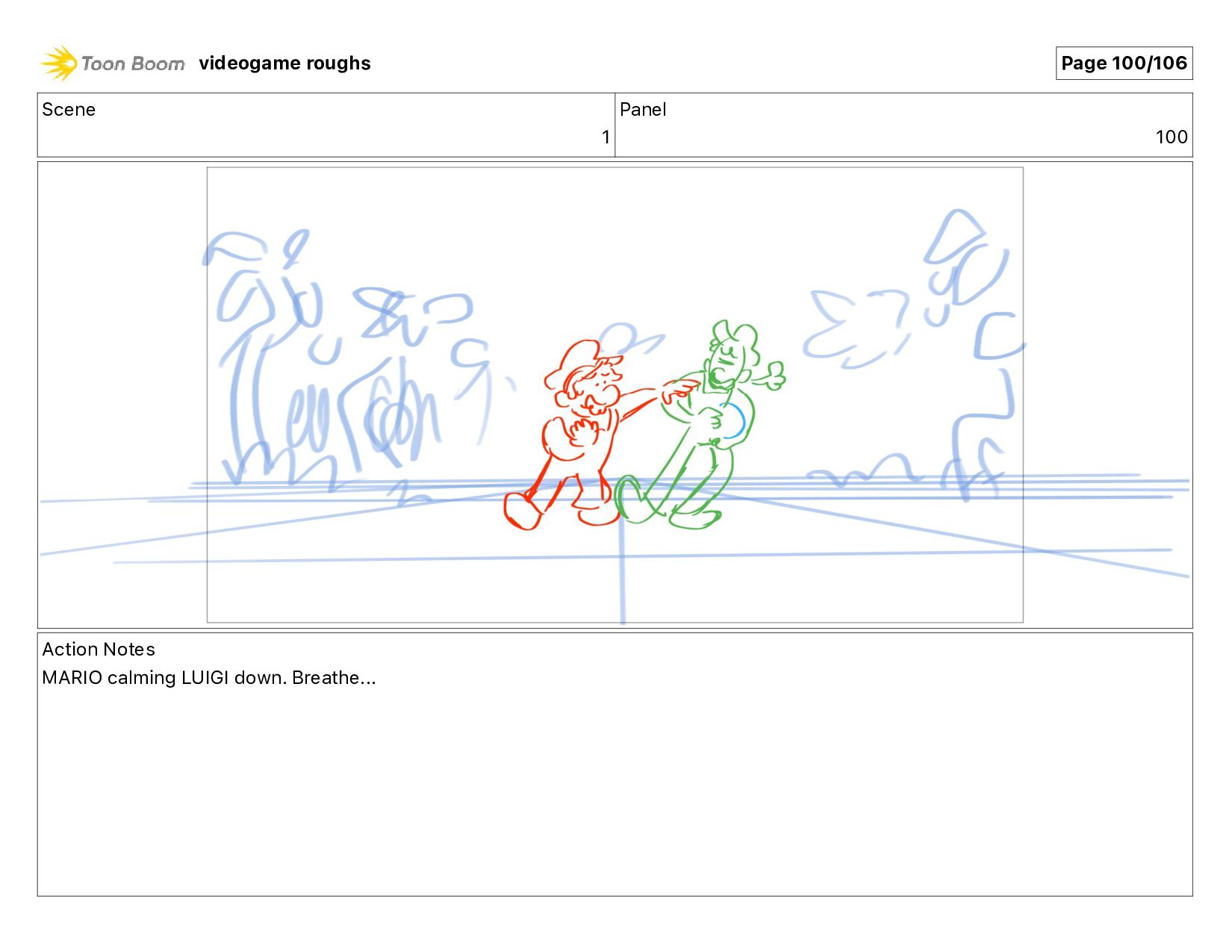Scene 1 Panel 100 Action Notes MARIO calming LUIGI down.