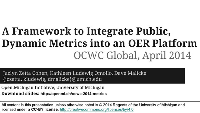 In this talk we discuss the first year of University of Michigan’s project to share its usage data for the OER on the Open.Michigan website in more useful, accessible, and timely ways for our authors and for the general public. First, we will review the process and results of our semi-structured interviews aimed to identify which metrics and indicators were of particular interest to our audience. Next, we will explain our stratified technical design, which consists of a customized open source content management system named OERbit with flexible hierarchies and a custom open source metrics plug-in that synthesizes metrics via application programmable interfaces (APIs) from content that is locally hosted as well as content that is referenced as external links. Lastly, we will discuss future directions for the project, both conceptually and technologically.