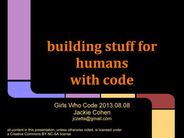 A talk about why people are central to all things programming. (Also why I love it, what I do, and stuff to think about when you start to think about UX.) For the Detroit Girls Who Code summer immersion program, given 2013.08.08.
