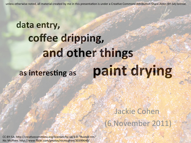 All content created by me is licensed under a CC-BY-SA 3.0 Unported License. Other applicable licenses are noted on slides.