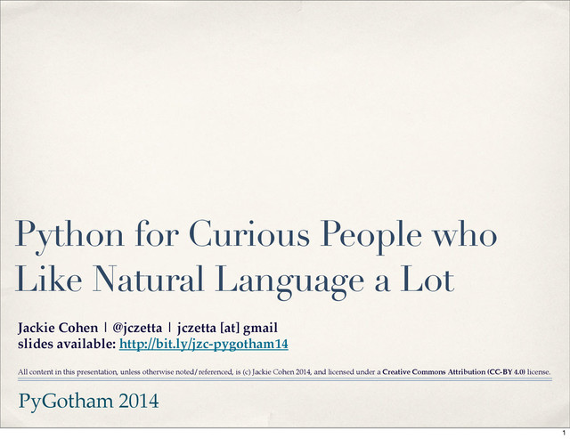 Rather than going into details of algorithms, here I give some simple, easy-to-build-upon examples of how Python and open source Python packages can be used to quickly dive into some really awesome aspects of research/investigation in linguistics, and bring them together to explain, at a high level, why I believe Python is an excellent bridge between linguists interested in programming, beginning programmers interested in linguistics, and any curious people who like figuring stuff out about languages all along a spectrum of formality. Given at PyGotham 2014.