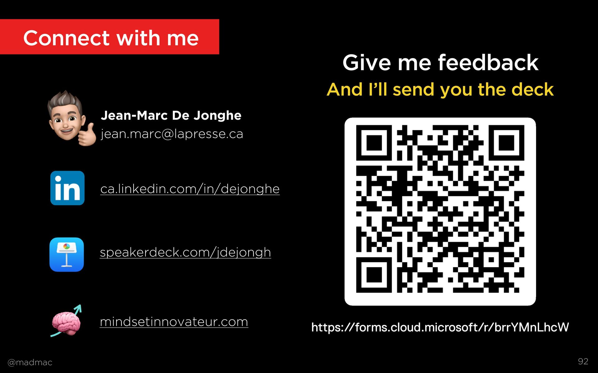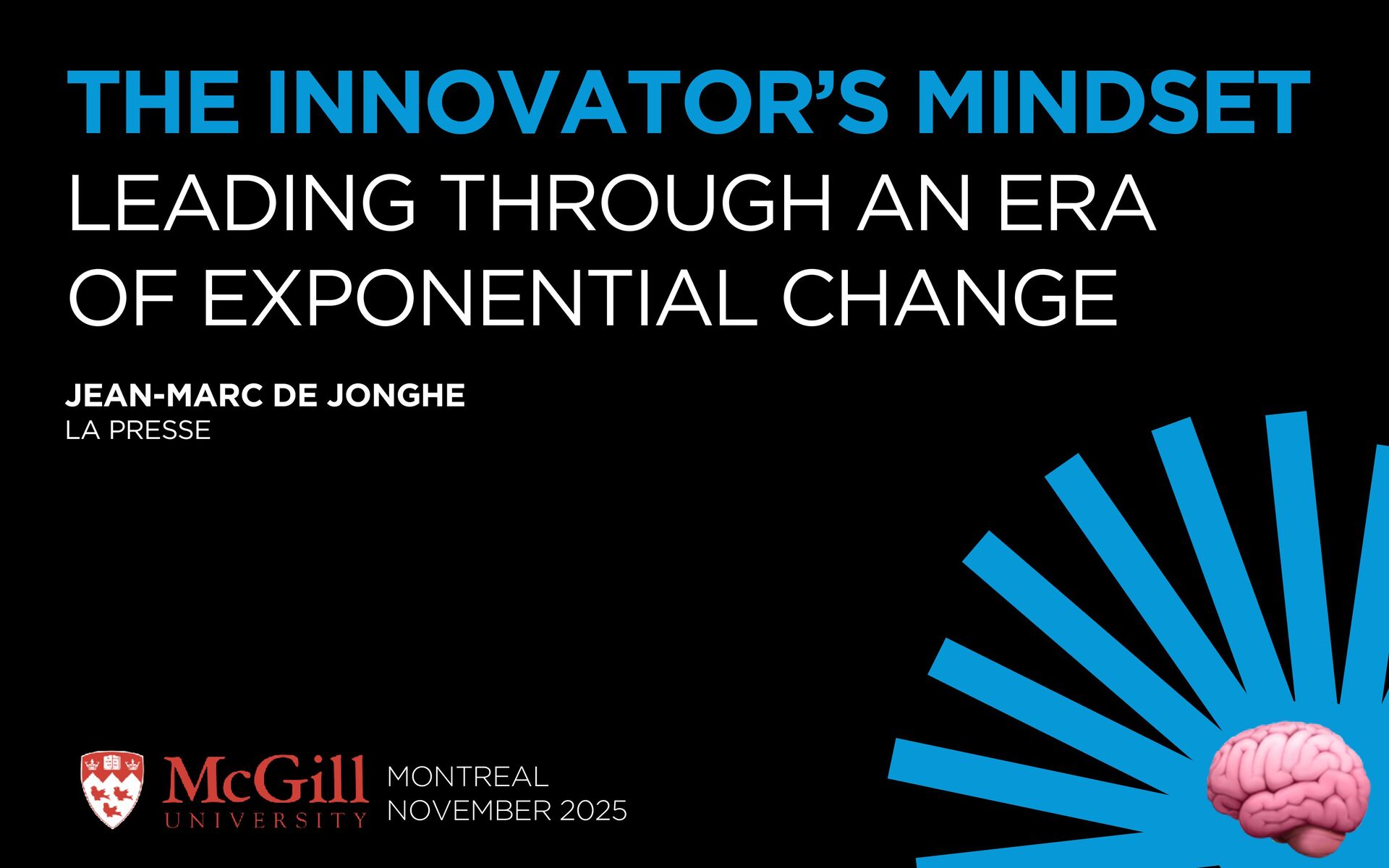 "The Innovative Mindset" is not just a conference on digital transformation, it is a real invitation to rethink the way we learn, collaborate and lead. By sharing his experience of transformation at La Presse, Jean-Marc De Jonghe demonstrates that the success of a digital transition is based on adaptability, collaboration and, above all, on people. The impactful images of his presentation reinforce this message: to be relevant tomorrow, we must dare to reinvent ourselves today.