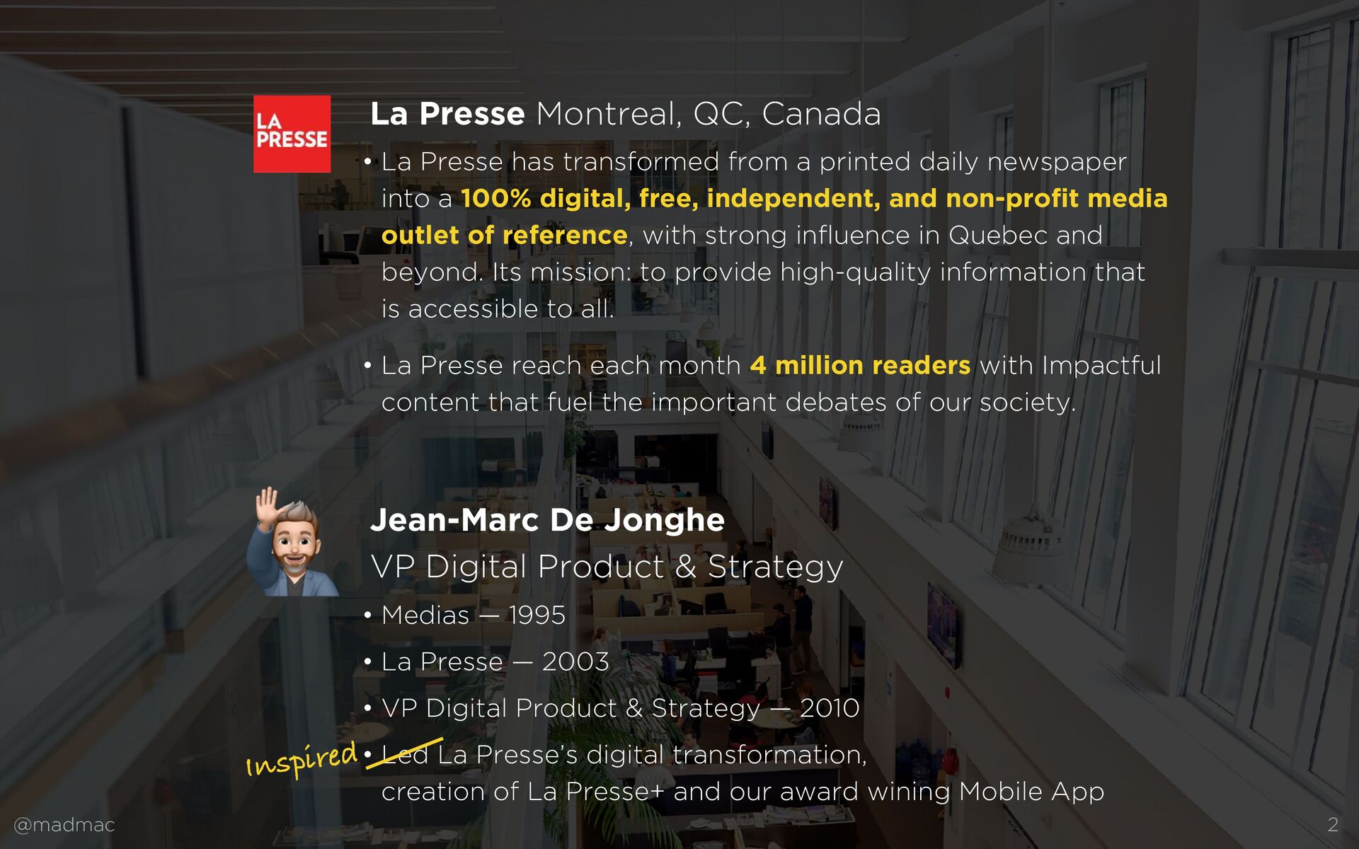 At this conference, Jean-Marc humbly shares with us his experience as a leader and privileged witness of the titanic transformation of La Presse and the creation of its innovative products: the digital edition for tablets La Presse+, the Mobile app and its "Mobile first" creation tools in order to share with us learning that will inspire us to find innovative solutions to our problems of tomorrow and will help us personally create the professional career of our full potential.