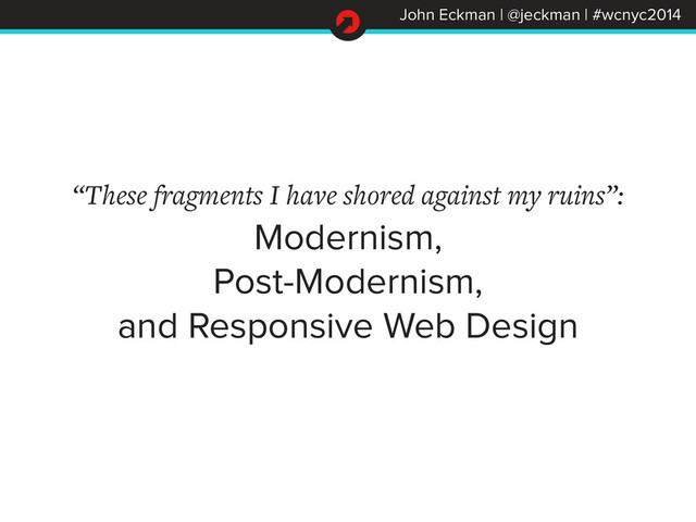 This talk takes the philosophical and literary-historical shift/tension between modernism and post-modernism and looks for signs that might help us understand the shifting sands under our own digital feet.