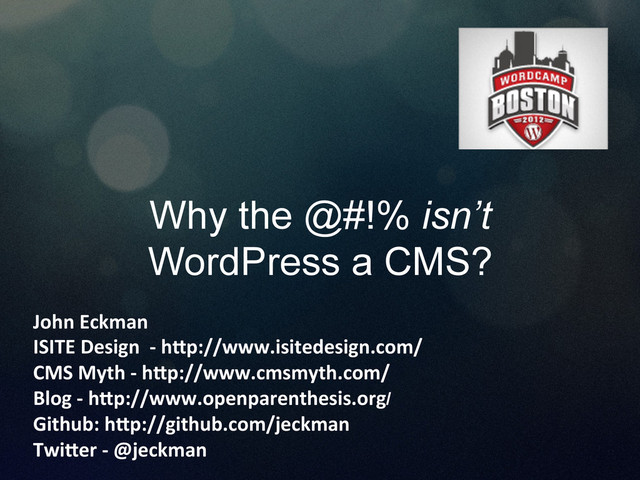 The traditional CMS world still looks down at WordPress as “just a blogging platform.” After the merge of multiuser with core, custom post types, BuddyPress, and all the fabulous plugins that build on core, why are some folks still not able to see WordPress as a content management system? I’ll explore some of the reasons both technical and cultural.