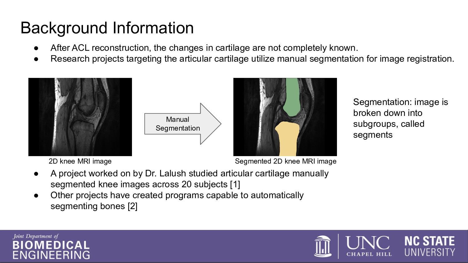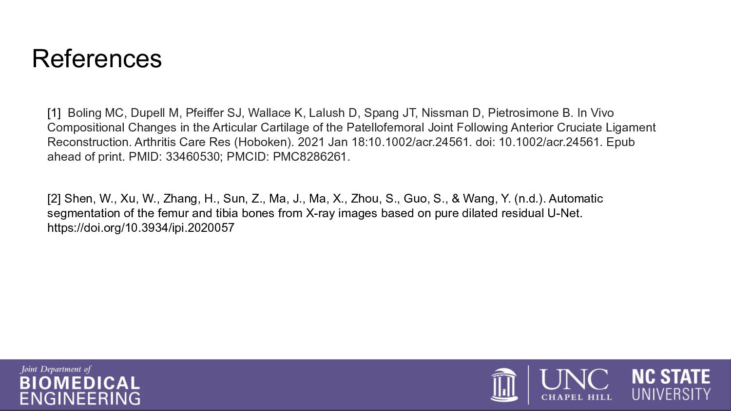 Lalush D, Spang JT, Nissman D, Pietrosimone B. In Vivo Compositional Changes in the Articular Cartilage of the Patellofemoral Joint Following Anterior Cruciate Ligament Reconstruction. Arthritis Care Res (Hoboken). 2021 Jan 18:10.1002/acr.24561. doi: 10.1002/acr.24561. Epub ahead of print. PMID: 33460530; PMCID: PMC8286261. [2] Shen, W., Xu, W., Zhang, H., Sun, Z., Ma, J., Ma, X., Zhou, S., Guo, S., & Wang, Y. (n.d.). Automatic segmentation of the femur and tibia bones from X-ray images based on pure dilated residual U-Net. https://doi.org/10.3934/ipi.2020057