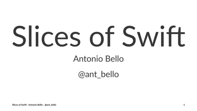 50] for index in 0..<array.count { print(array[index]) } Closed'range'operator for elementNumber in 1...array.count { print("This is the element no. \(elementNumber):" + "\(array[elementNumber - 1])") } Slices'of'Swi+','Antonio'Bello','@ant_bello 55
