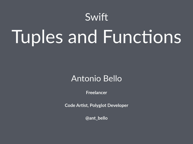 Swi$ Tuples'and'Func-ons Antonio&Bello Freelancer Code%Ar(st,%Polyglot%Developer @ant_bello