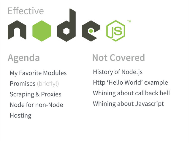 example Whining about callback hell Whining about Javascript Whining about other languages that can do all this stuff that Node.js nerds think is so cool My Favorite Modules Promises Scraping & Proxies Node for non-Node Hosting !