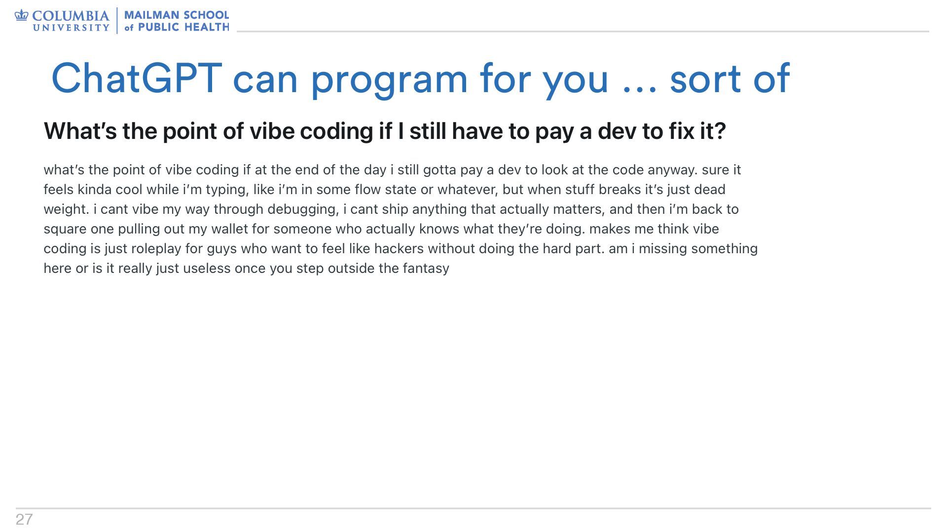 but it was brief, shallow, and now about twenty years out of date. GPT-4 on its own is, for the moment, a worse programmer than I am. Ben is much worse. But Ben plus GPT-4 is a dangerous thing. I still feel secure in my profession. In fact, I feel somewhat more secure than before. ... The thing Iโm relatively good at is knowing whatโs worth building, what users like, how to communicate both technically and humanely. I suspect that ... we will think of โthe programmerโ the way we now look back on โthe computer,โ when that phrase referred to a person who did calculations by hand. Where is the value in being a โprogrammerโ now?