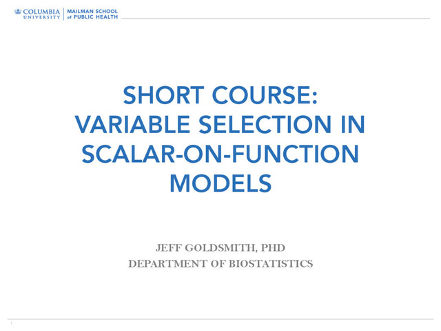 the case of one predictor • Expand coefficient using basis • Construct row vector of integrals; focus on basis coefficients • Domain may vary across predictors • Goal is to estimate collection of basis coefficients • Each vector has length K • For many predictors xil (t), variable selection may be necessary yi = 0 + p X l=1 Z xil( t ) l( t ) dt + ✏i [ T 1 , . . . , T p ]T