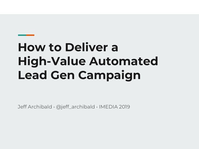 These slides are part of a 3-hour masterclass workshop delivered at iMEDIA 2019. The workshop was hands on, using a Google Doc workbook available here: http://bit.ly/leadgen-template. As the workshop jumped back and forth between these slides, the Google Doc workbook, websites, and MailChimp, the deck is not comprehensive to the entire workshop. But, combined with the workbook, the content is still useful.