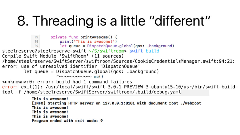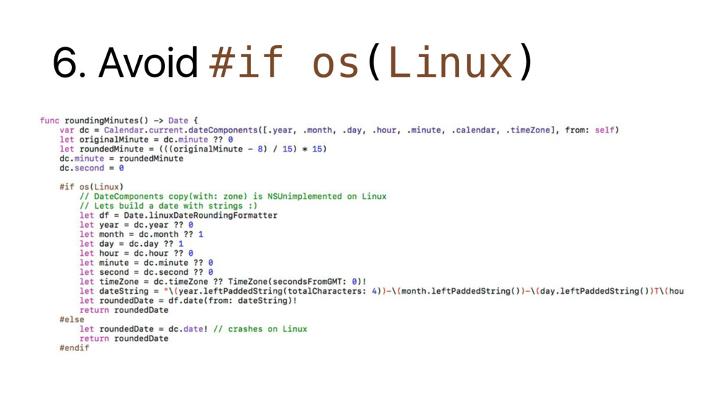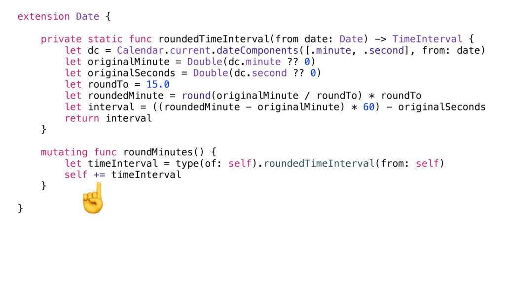 Calendar.current.dateComponents( [.year, .month, .day, .hour, .minute, .second, .calendar, .timeZone], from: Date() ) // get originals and do rounding let originalMinute = Double(dc.minute ?? 0) let roundTo = 15.0 let roundedMinute = Int(round(originalMinute / roundTo) * roundTo) // modify components dc.minute = roundedMinute dc.second = 0 // generate new date let roundedDate = dc.date! // crashes on linux // fatal error: copy(with:) is not yet implemented: file Foundation/NSCalendar.swift, line 1434