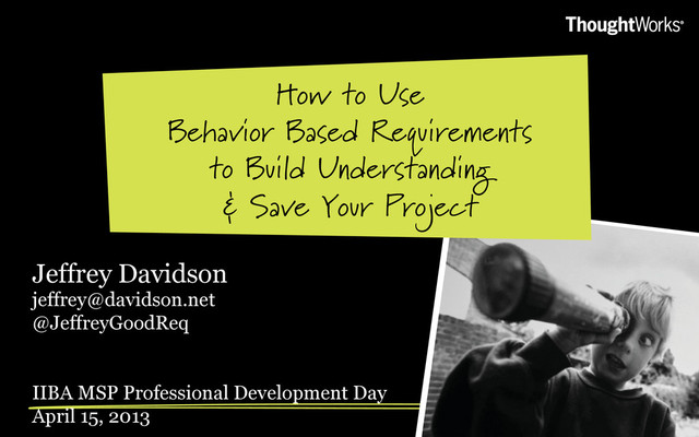 There is confusion on your projects and you struggle to get people to understand what needs to be built and why. It doesn’t have to be this way--you can build a common understanding with your team and your stakeholders using Behavior Based Requirements.